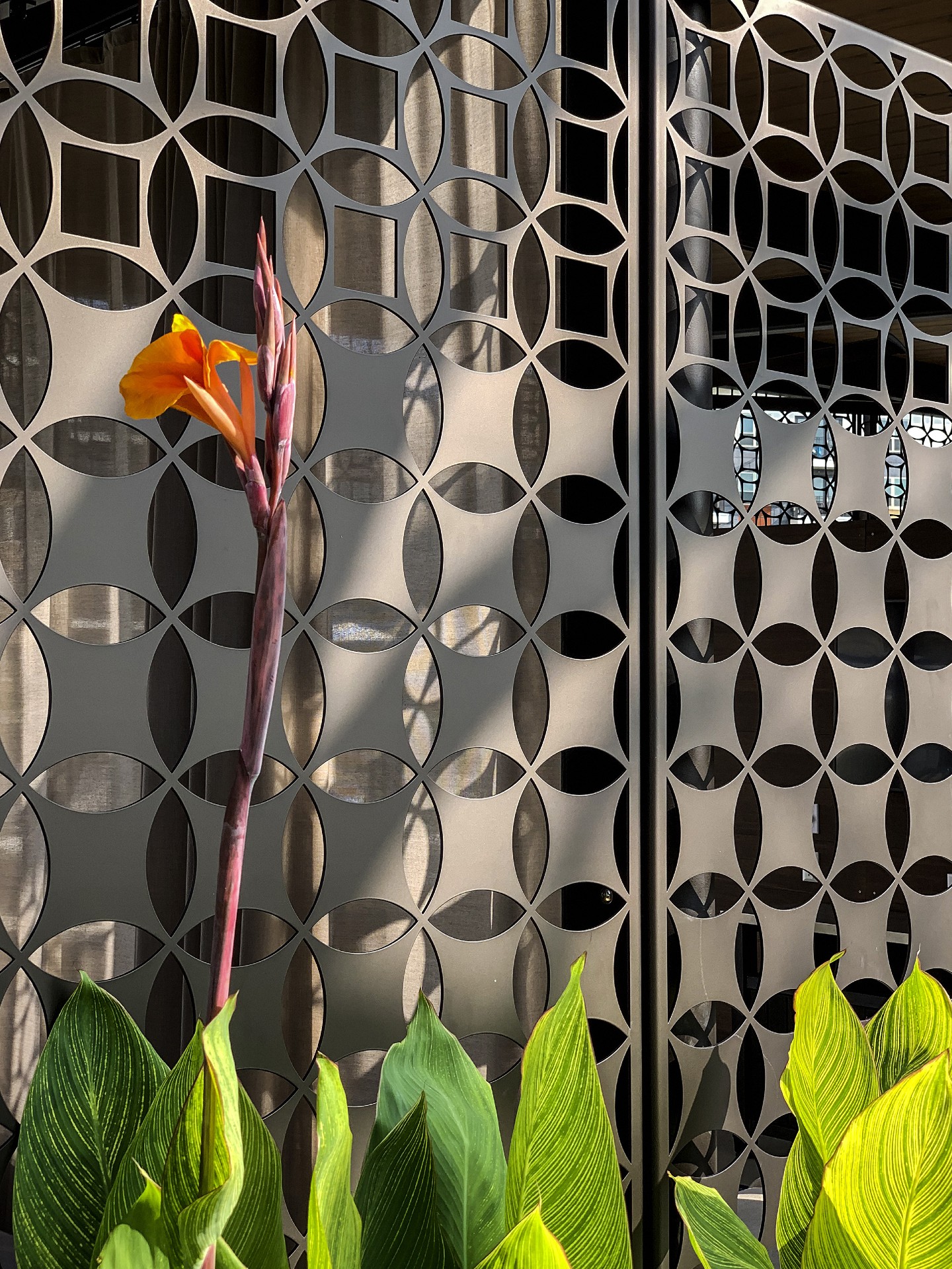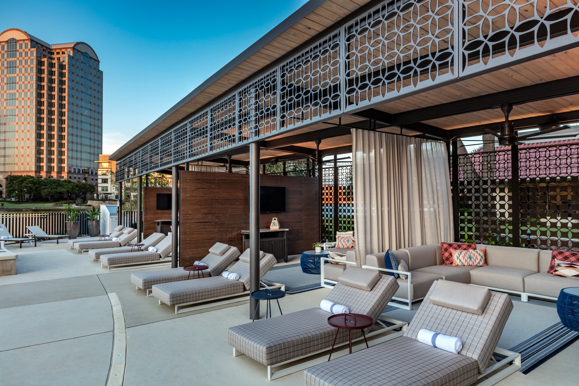 For privacy, the pool cabanas needed to be shielded from the lobby. A custom-designed screen with large and small cut-outs helps preserve the privacy of guests on both sides, while adding visual interest and allowing light to the space.