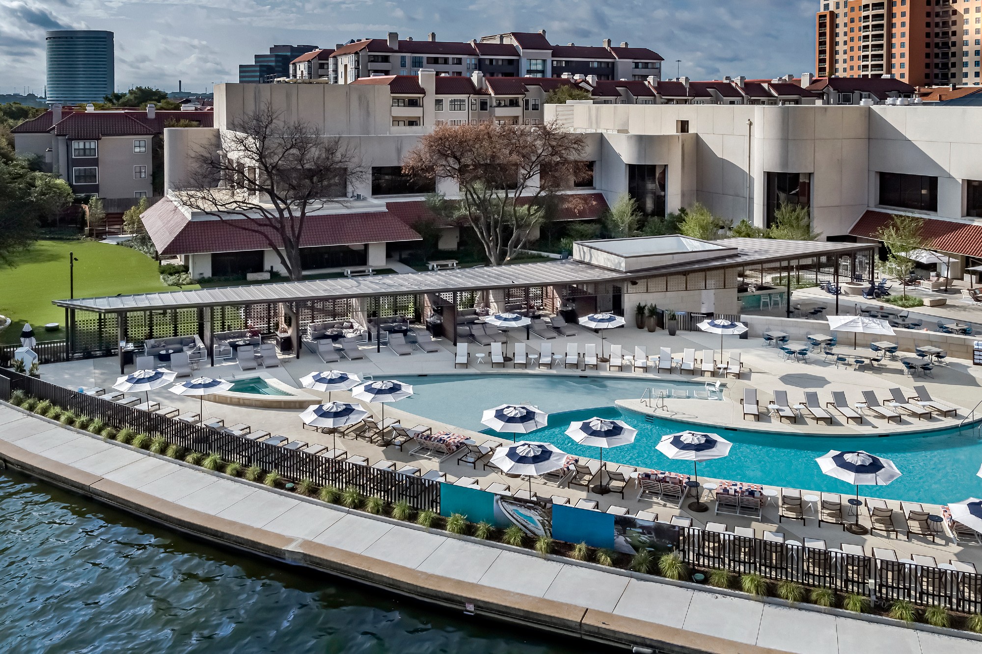 Visitors are easily drawn in with a pool that overlooks Lake Carolyn, along with a hot tub, hospitality pavilion that includes bars and cabanas and dining/entertainment areas. The space also includes three event lawns, game courts, fire pits with seating, and a leisure garden to stage entertainment and games.