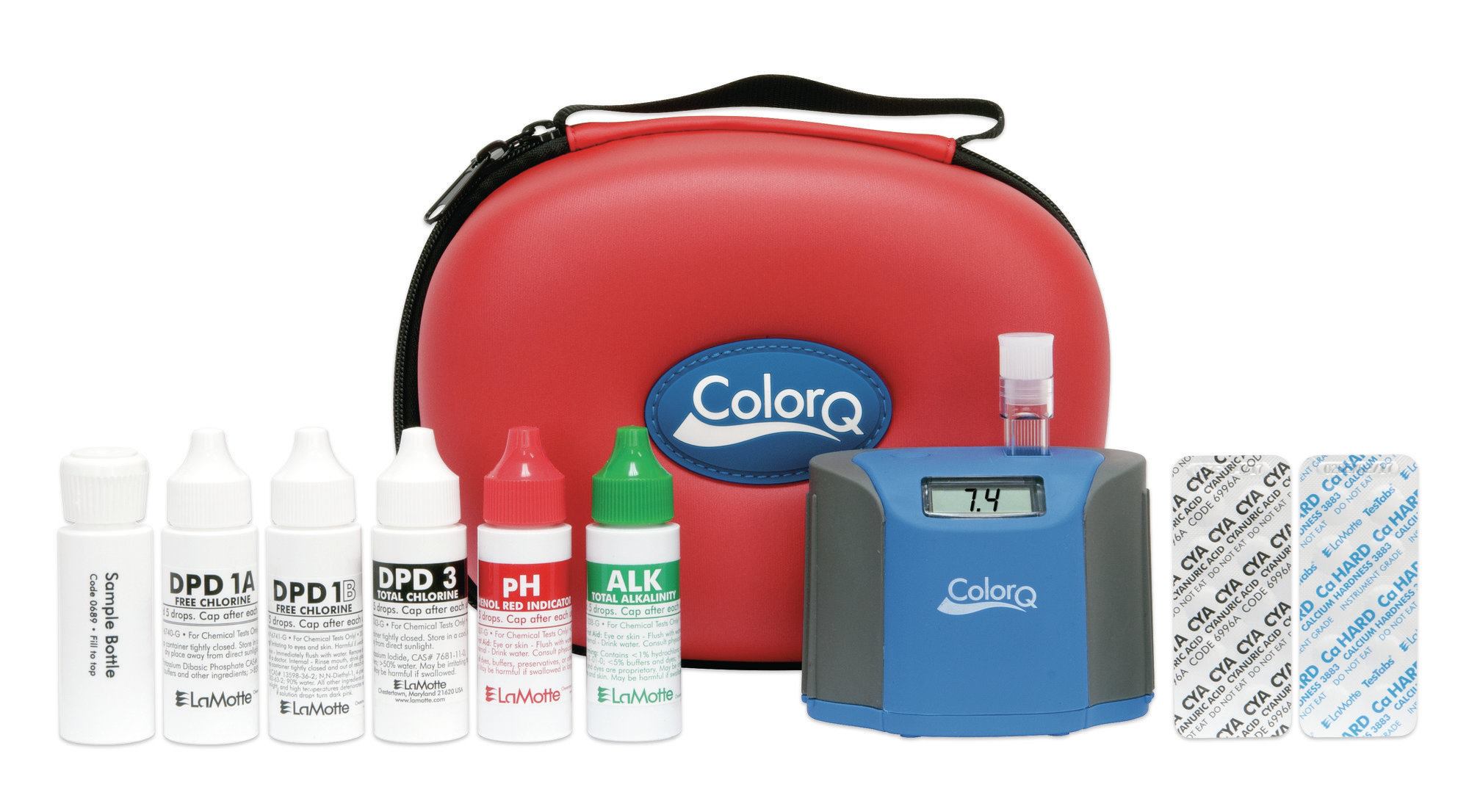 The ColorQ PRO 6 handheld photometer from LaMotte measures free and total chlorine, bromine, pH, alkalinity, calcium hardness and cyanuric acid. The handheld meter is easy to use and features economical liquid reagents that measure 144 tests per test factor for free and total chlorine, bromine, pH and alkalinity. The calcium hardness and cyanuric acid tests are measured using the TesTabs tablet method and includes 100 tablets for each test.
