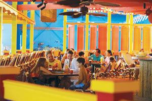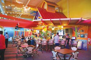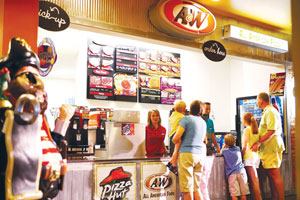 Audio visual systems introduce movies shown on a large screen that doubles as a ship’s sail, offering families entertainment options within the waterpark. Guests can enjoy A&W, Pizza Hut or a drink at the open bar area.