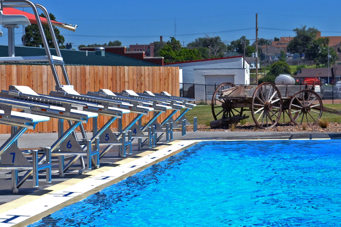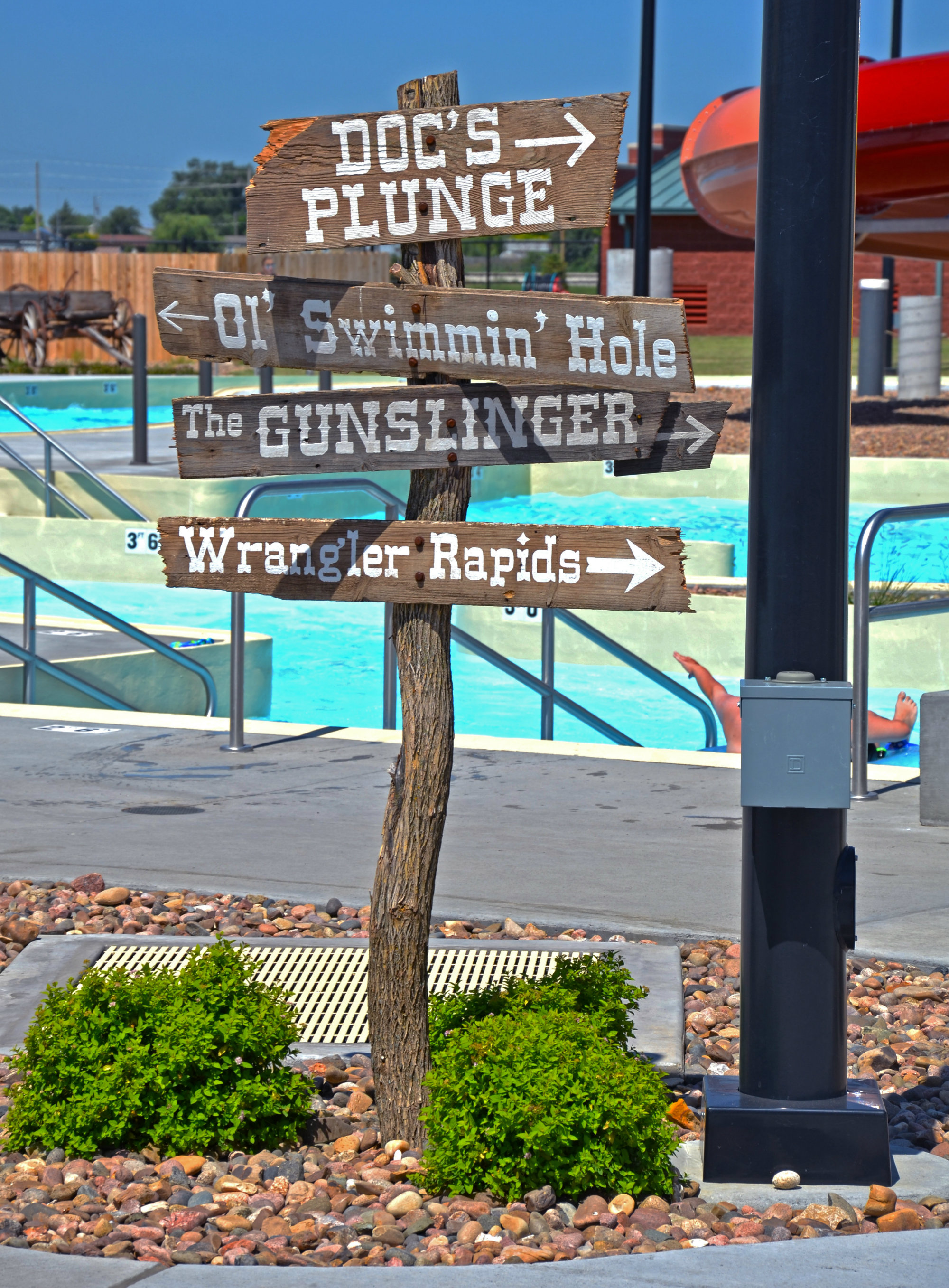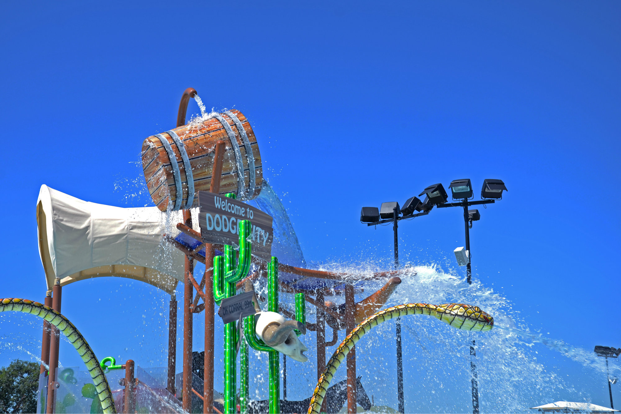 A western/prairie theme was a given. The park’s name plays off the Long Branch Saloon, famous for shootouts and standoffs. Spraying windmills, rock waterfalls, wooden buckets and “tin” dumping buckets, along with features that look like snakes, cacti, and cattails reinforce the theme. Historic Dodge City architecture, to coordinate with a downtown retail renewal, included red brick bathhouse and filter buildings and exposed wood beams. Wood post and rail fencing surround deck features, and muted colors are used throughout. Several historic items were donated, including an outhouse, well pump, hitching post, barrels, stock tank and wooden wagon.