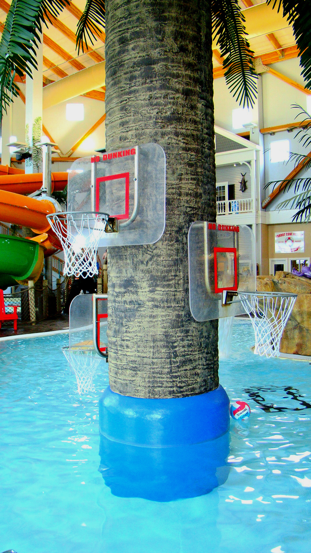 The team had to erect the waterpark in an existing building. This meant designing around support columns — most of which stood in the center of the building. These vertical elements were integrated into features: One might be hidden in a rockwork structure, while another might support a faux palm tree basketball column.