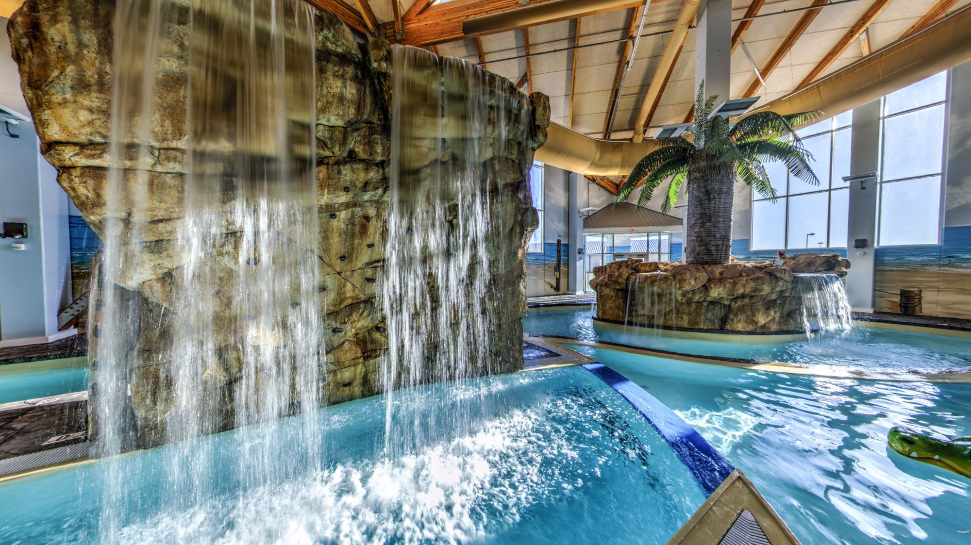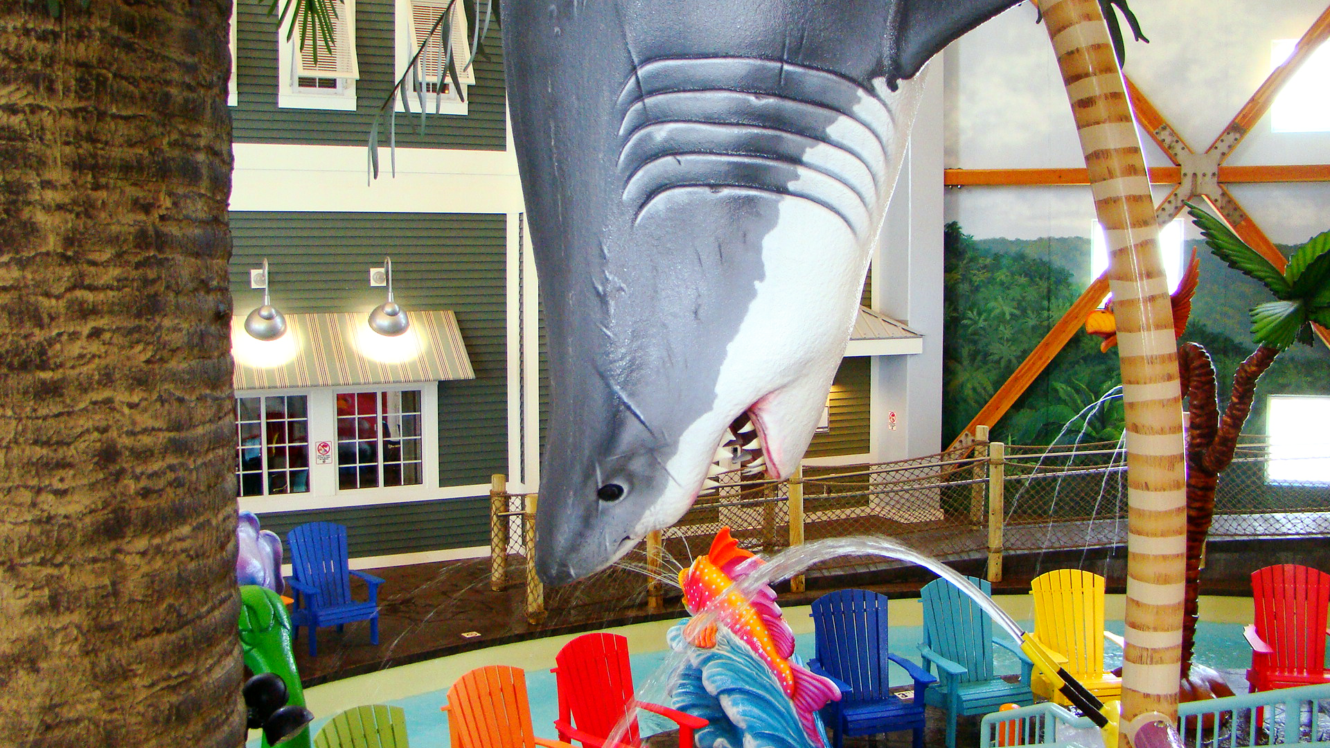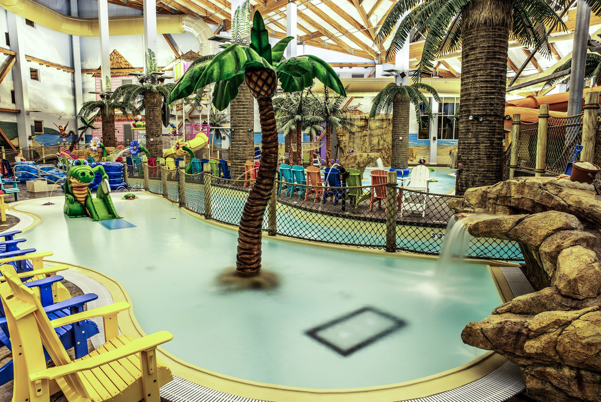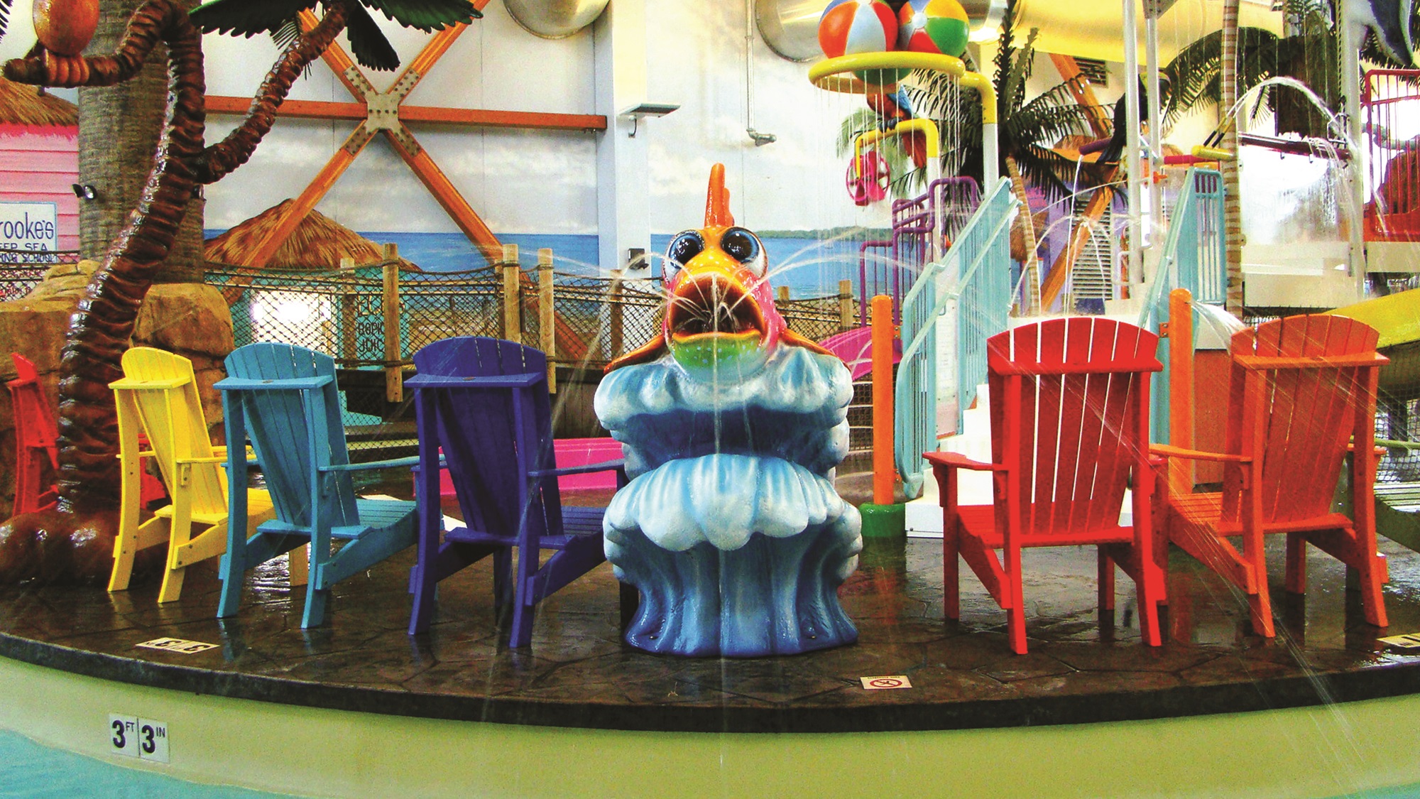 This nearly 33,000-square-foot indoor facility packs a lot of action for visitors of the attached hotel, as well as those who come strictly for the waterpark. Owned by a Jimmy Buffet fan, it was destined for the tropical. And it is themed to within an inch of its life. Even columns and park lights are disguised in faux palm bark and fronds. Three-dimensional murals highlight various destinations and provide backdrop for the lazy river. Play features mimic animals, flowers, and tropical plants.