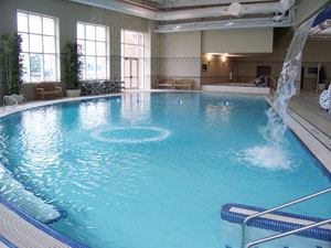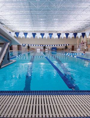 The leisure pool includes stair or pool-lift entry, underwater bench seating, a volleyball net, swim-in-place forced current and a spray feature with an overhead water curtain. The six-lane, 25-yard competition pool includes stair entry and pool lift. The warm-water therapy pool features a swim-in- place forced current, perimeter railings and a hydraulic pool lift.