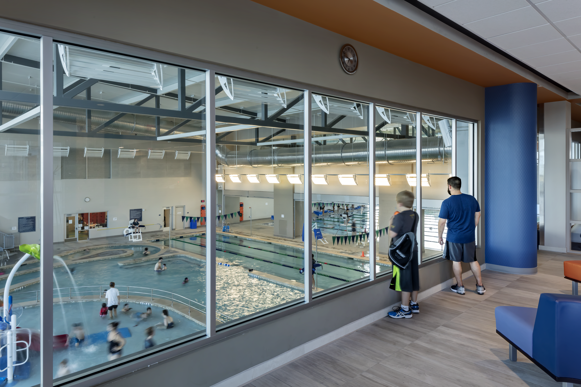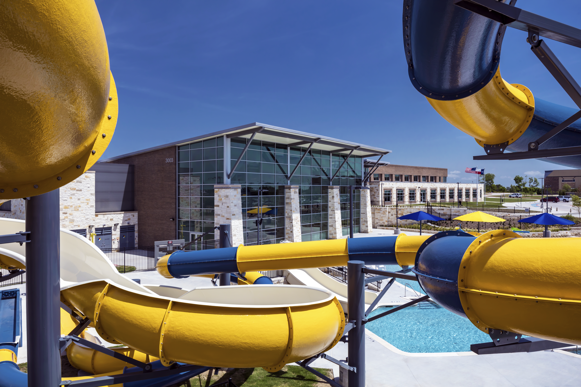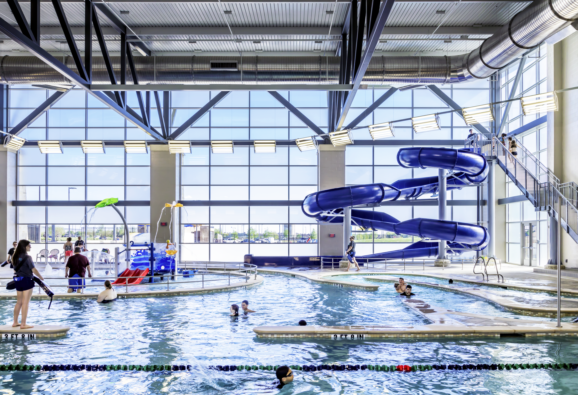 For broad appeal, the design team included a 10,000-square-foot leisure pool with a spray play area, current channel, wet lounge and 770-square-foot toddler pool. Four waterslides round out the area. Inside, visitors find a waterslide, 11-lane competition pool, and a leisure pool with splash play area, play structure, current channel and three additional laps lanes.