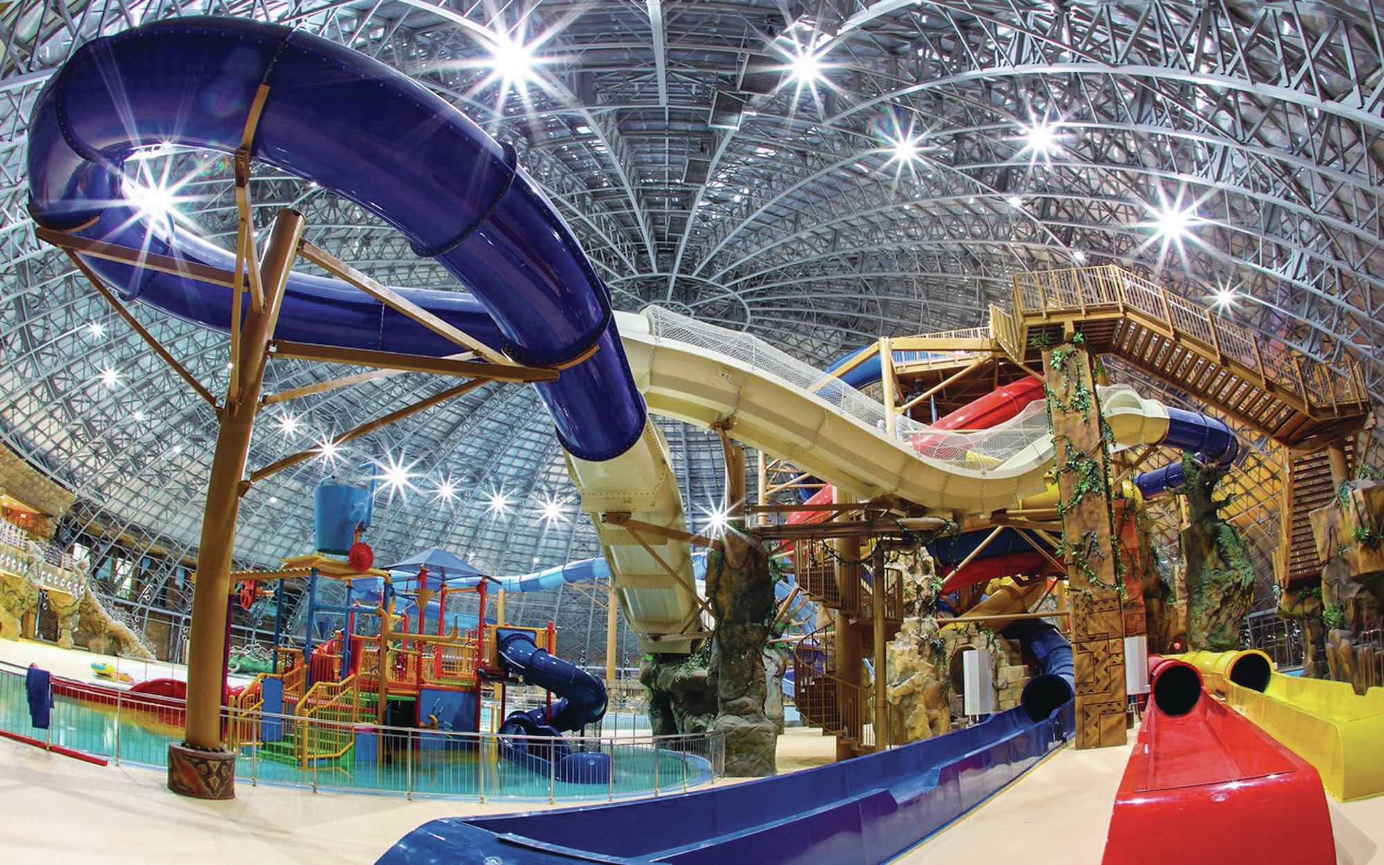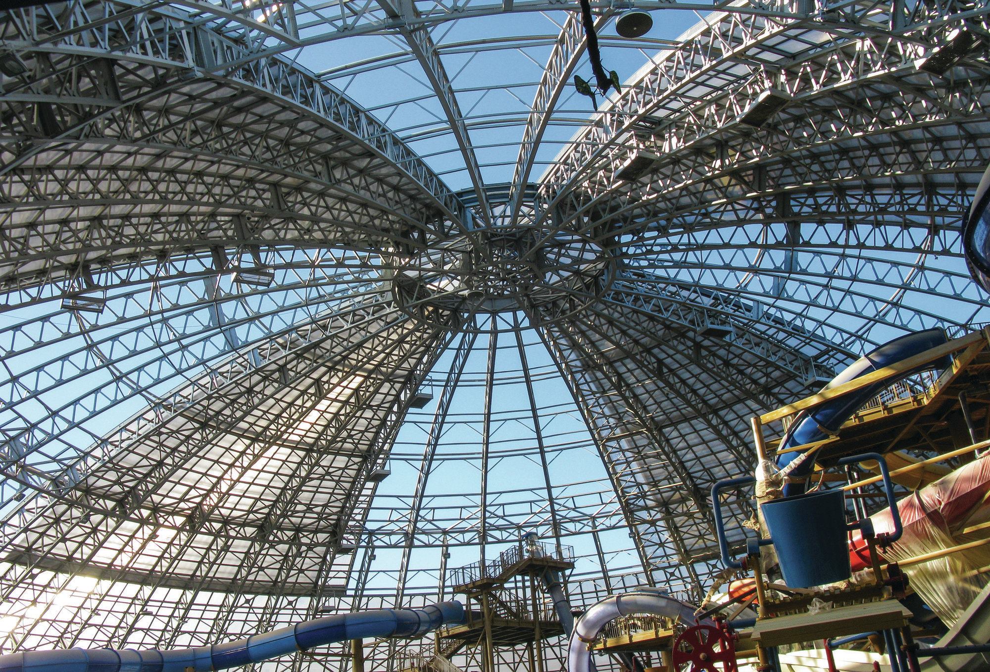 A retractable aluminum roof lets visitors enjoy the weather — or protects them from it — and offers an opportunity for energy savings. Aqua Sferra Waterpark | Donetsk, Ukraine