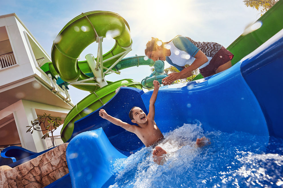 The design and theming are meant to reflect the environs, with the structures crafted to look as if they had risen from the seafloor and onto the palm-shaped, man-made island. Corals and aquas combine the aquatic with desert. On the stone work in Immortal Falls Cliff Jump and Trident Tower, visitors see what appear to be etchings from a lost, ancient civilization. Splasher’s Cove includes aquatic flooring that looks like ocean waves approaching the children’s slides. Medusa’s Lair, with its racing tube slides, features imagery of the mythological figure to add to the overall theme.