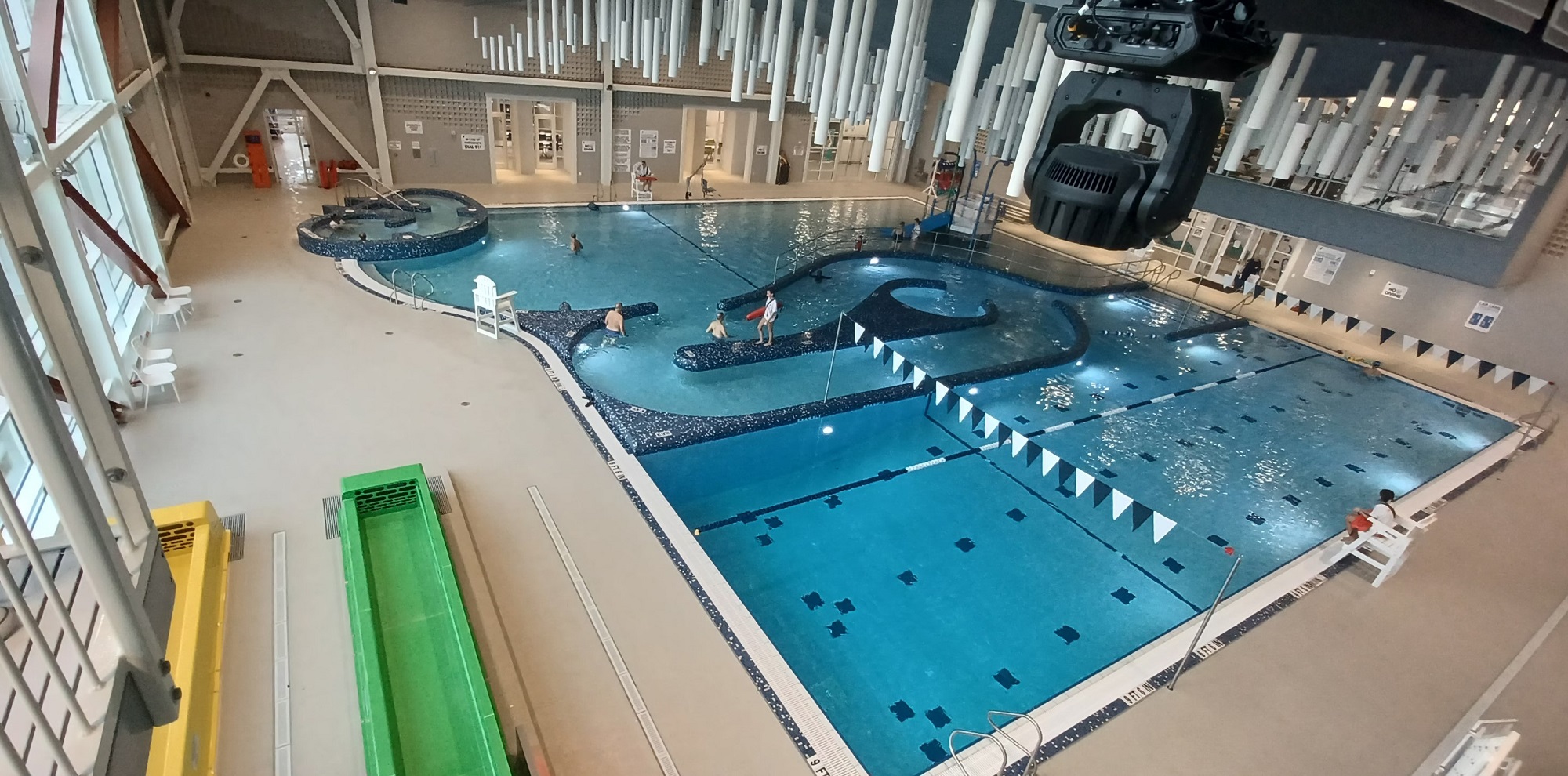 The indoor, multifunctional aquatics facility contains a 5,962-square-foot pool with three lap lanes, geysers, a current channel and children’s play area with interactive water-play features. This will hold most of the programming, such as learn-to-swim lessons, exercise and fitness, as well as lap swimming.