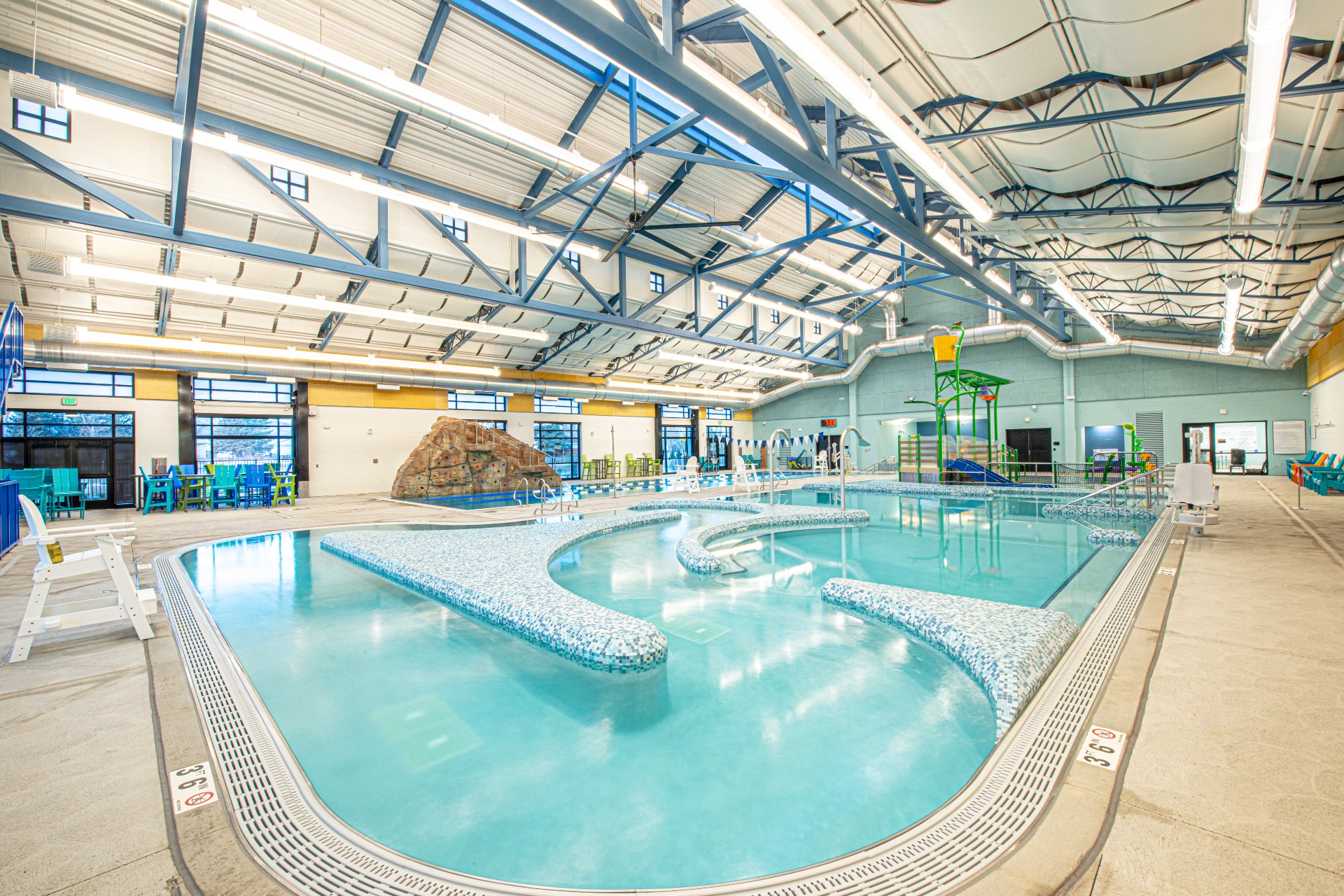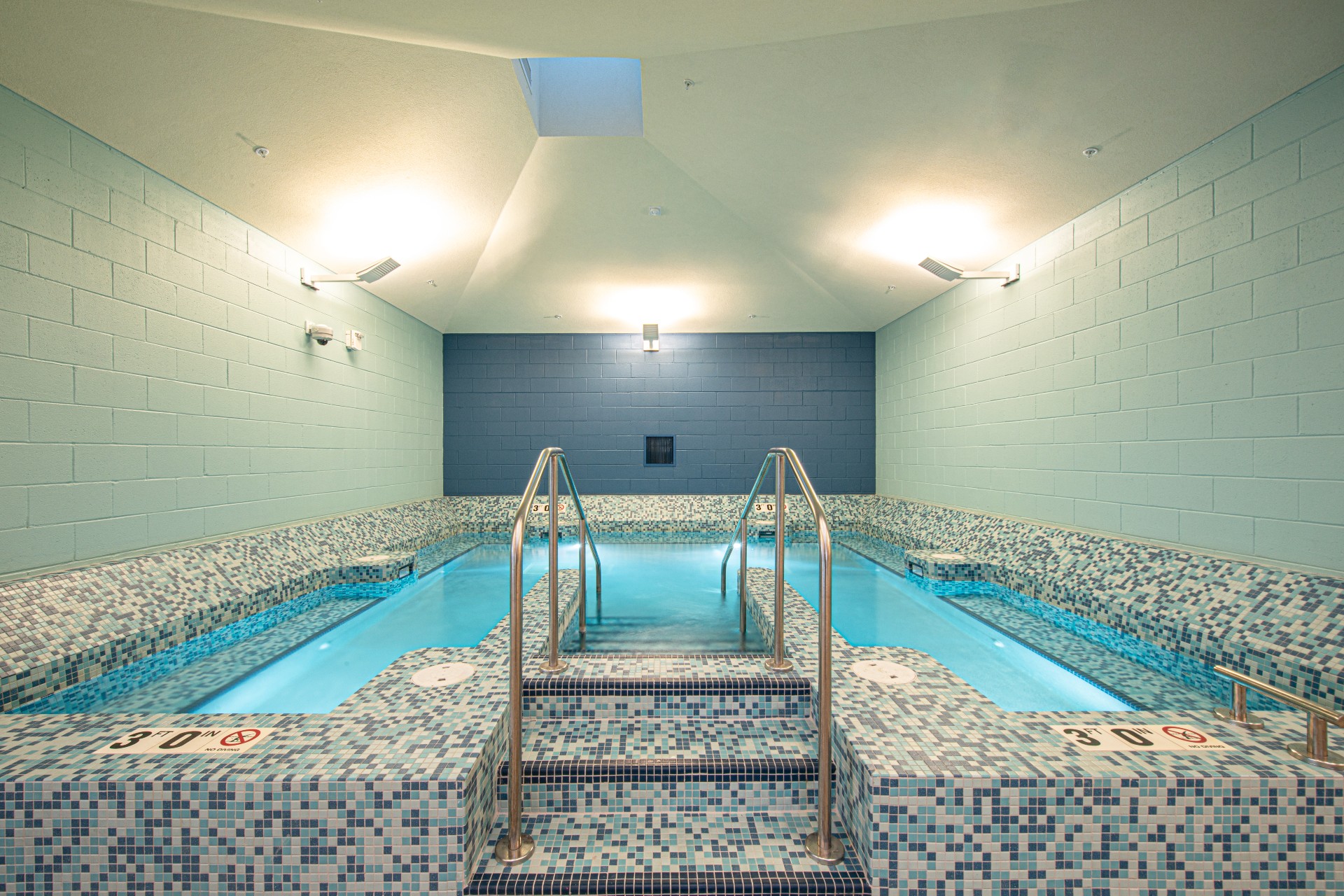 For older children and teens, the team included an interactive area, a two-story slide with a timer to spur friendly competition. A wet rock wall and two diving wells were included in the three-lane lap pool. The rock motif further ties in with the facility’s theme.
