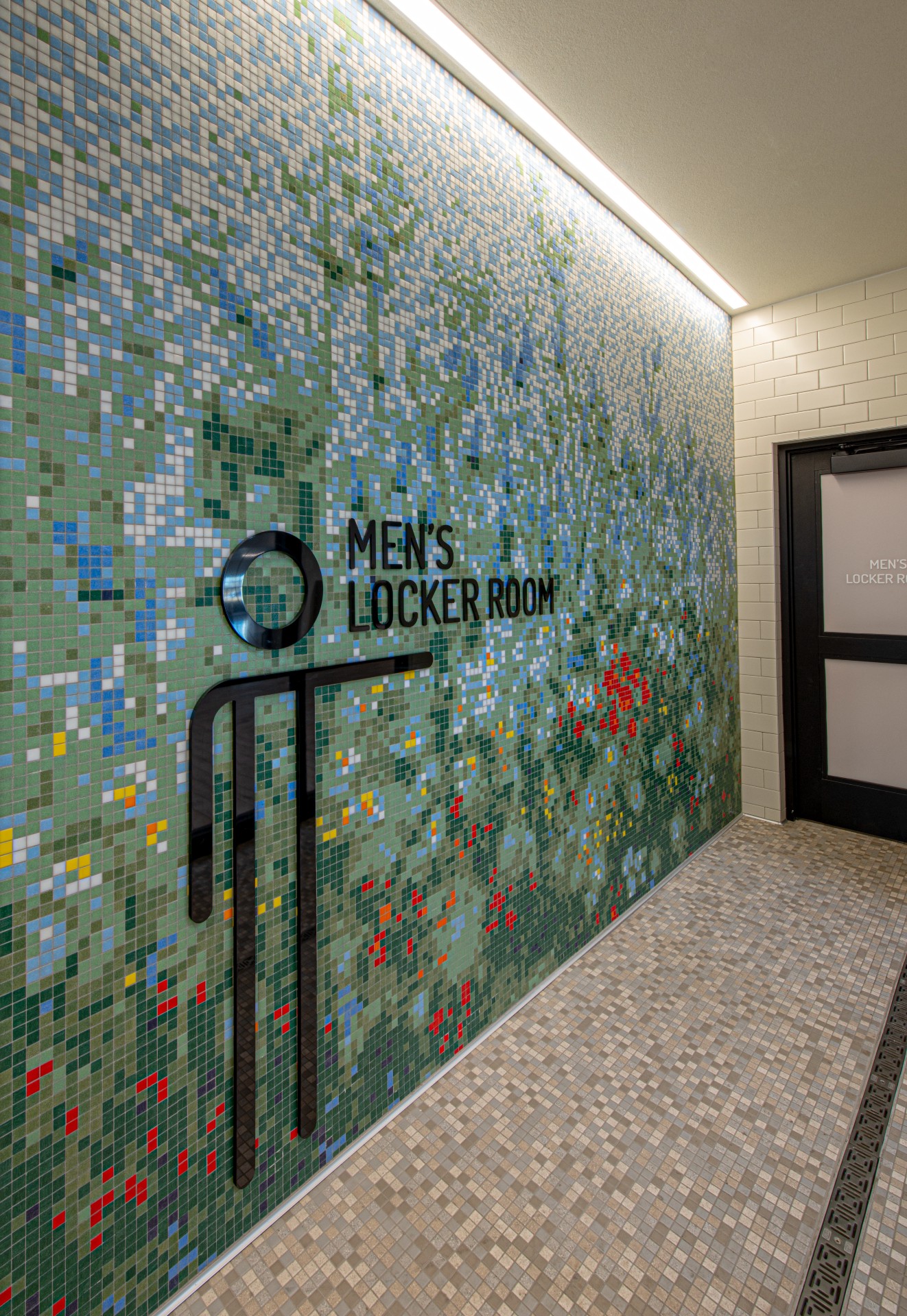The view of nearby Rock Mountain National Park provided plenty of inspiration. While researching the area, the team found a watercolor of Longs Peak by William Henry Holmes, created in 1874 and housed in the Smithsonian. They retained rights to recreate the image in a two-story glass-tile mosaic on one of the stairwells. Another mosaic was placed at the locker-room entrance.