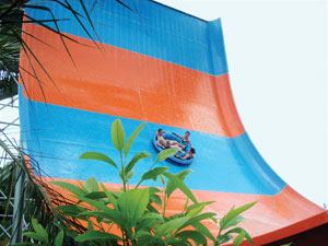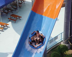 Another industry first, the Giant RainFortress is the largest children’s interactive water-play structure outside North America. This 59-foot-high, Hawaiian-themed play center can handle approximately 1,500 guests. It features more than 300 interactive water toys and play elements, including two giant tipping buckets, seven different water slides, and numerous levels and features. The Giant RainFortress is situated next to the high-thrill Free Fall Plus high-speed slide tower, featuring a speed slide and a body speed slide. The Master Blaster uphill water coaster and tornado raft ride are located nearby.