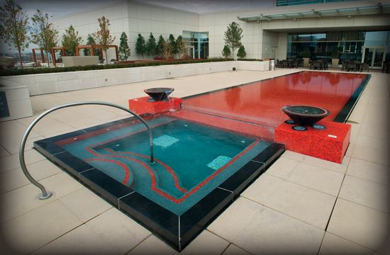 At the center of the deck is a reflecting pool finished in garnet red, glass mosaic tile, with a raised 4-inch black granite infinity edge. Positioned to mirror the St. Louis Gateway Arch, the fountain’s attached whirlpool spa is separated by a glass partition and flanked by raised water bowl fountains that cascade into the spa.
