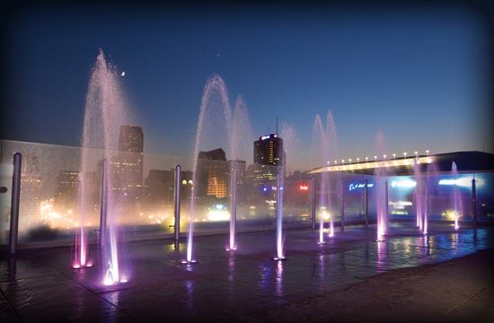 Located off to the side is an 850-square-foot deck fountain. Designed for splashing, the fountain includes a series of spray jets highlighted at night with color-changing lights computer-programmed to produce a multitude of facilitated sequences.