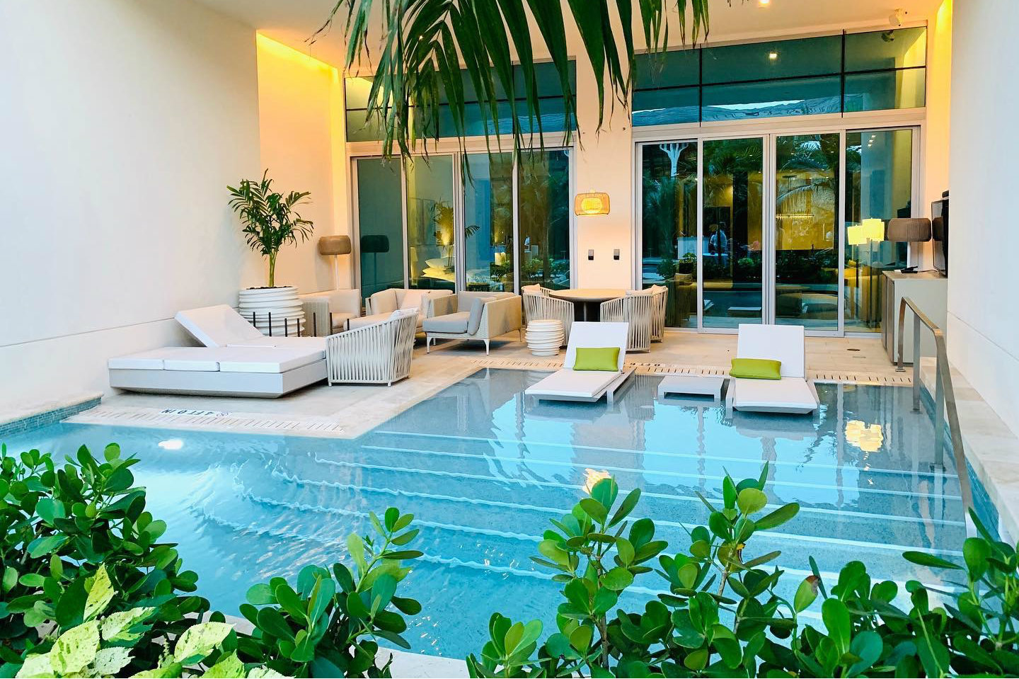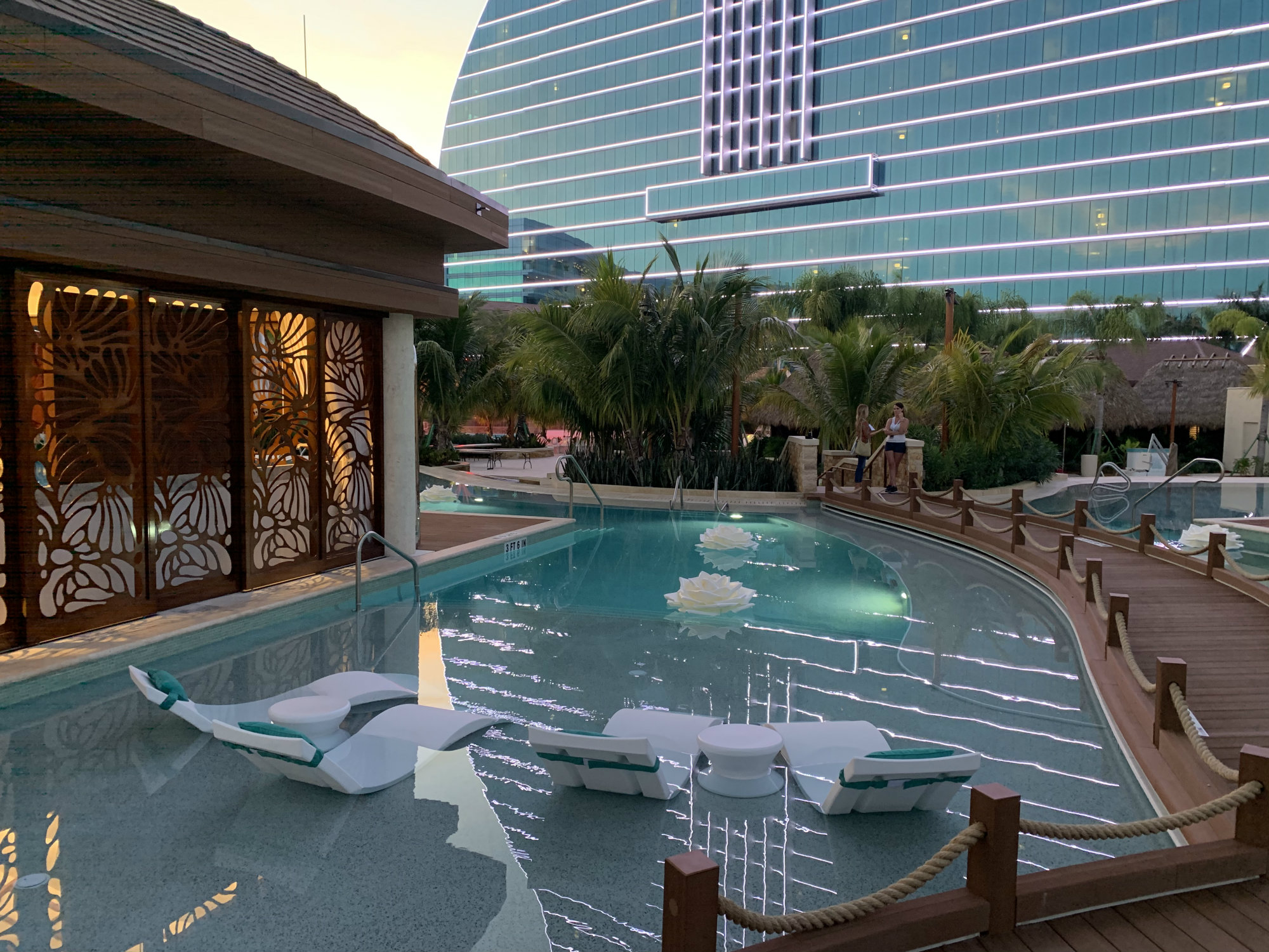 Tropical styling imparts a tranquil, natural vibe by day. All is brought to life at night with special lighting to enhance special events. Some of the cabanas were fashioned after traditional Seminole thatched-roof chickees as a tribute to the local tribe.