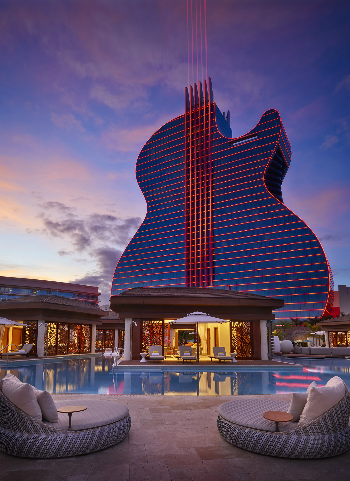 The new adult playground includes multiple pools to accommodate upscale lounging, entertainment and other activities. The main pool, adjacent to the hotel’s trademark guitar tower, features rental cabanas and a stage for performances. The VIP pool brings the water directly to first-floor suites, where guests can step outside and onto their own sunshelf. The Bora Bora section includes fully equipped, rental bungalows that appear to float on the water. Boardwalks provide access. A series of waterfalls connect this area with the main pool deck.