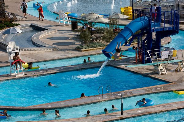 Dream amenities: 645-foot lazy river/leisure pool combination with a wet deck and four lap lanes; A diving well with a drop slide and diving board; 25-person hot tub; 8-lane training/lap pool; and a bubble “couch”