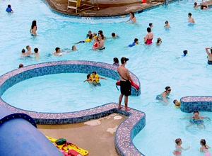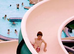 The 16,970-square-foot aquatics center features two pools, one hot tub, two lazy rivers, three vortex pools, three water slides, and two sets of water-playground equipment, with amenities split evenly between indoor and outdoor spaces.