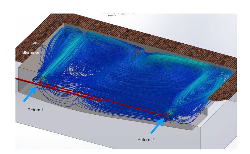 The multi-colored lines indicate the flow path that 50 different “water molecules” took as they traveled through the piping and around the pool. Notice how they are “pushed” by the return inlets and the currents until they pass close enough — within about 2 feet — of the skimmer and drains to exit the pool.