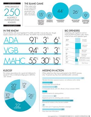 If operators are a bit apathetic about federal mandates, they’re clear about their role in those codes. Less than 1 percent of aquatics facility operators believe they had the biggest voice in passing VGB and the pool accessibility requirements under ADA, according to an online survey of approximately 250 Aquatics International readers. That sentiment illustrates one of the central issues, particularly in the case of VGB.