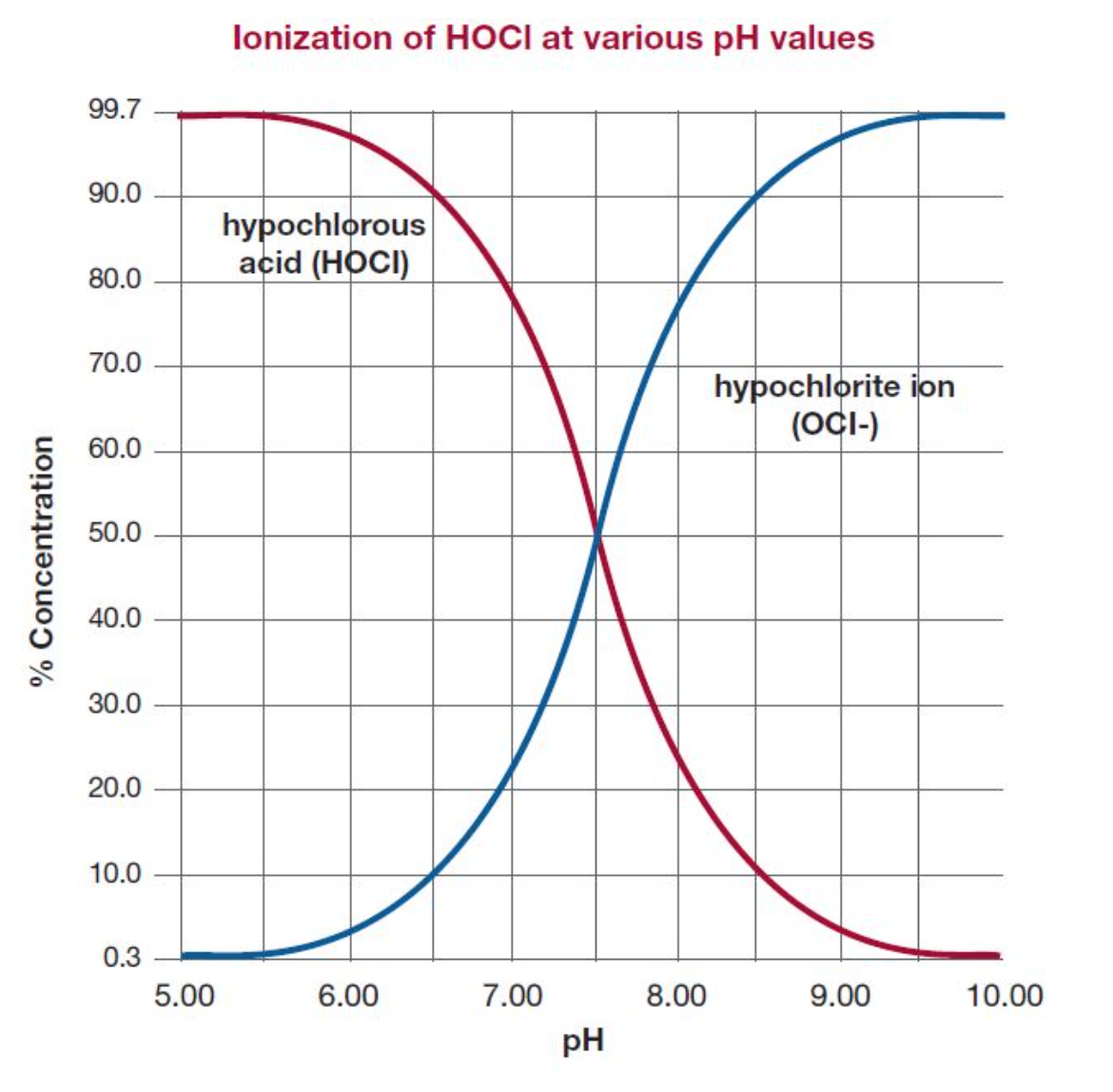 The chart above illustrates what happens to the HOCl compound as the pH rises. Note that at a pH of 8, which is legal in California, the amount of free chlorine that remains as HOCl is less than 20%. The rest is OCl-. Yet at a pH value of 7.2, the free chlorine is almost 70% HOCl, making it more than three times as active with about three times the work value. So 1.0 ppm can have the same disinfection and oxidation value of almost 5.0 ppm, depending on the water’s pH.