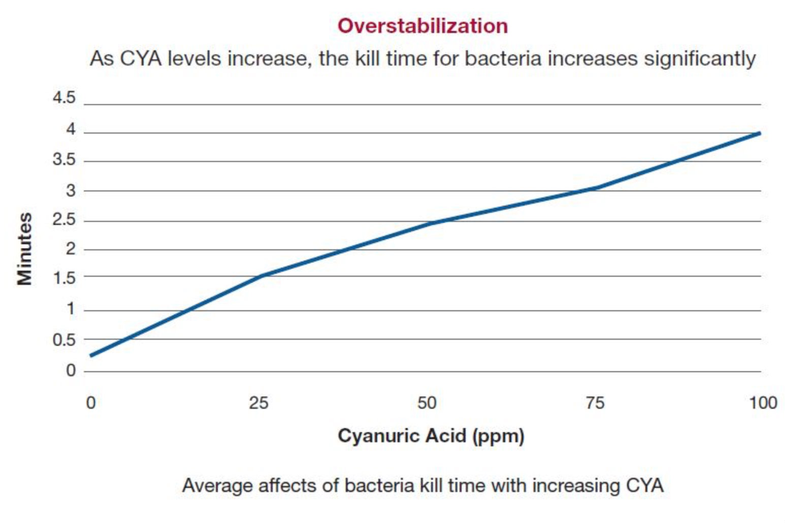With regards to CYA, much has been written by water chemistry experts about its effect on the work value of chlorine, with studies showing a significant increase in the time required for chlorine to inactivate various pathogens.