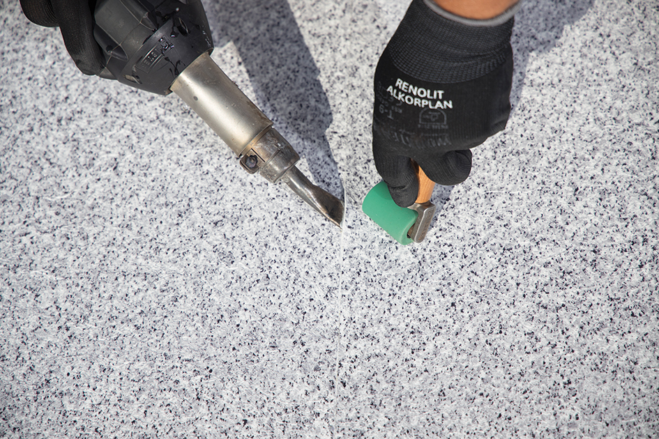 Once the membrane is held in place with the spot welds, installers begin to apply the welding gun down the full length of the seam. They insert the welding nozzle under the overlap and heat both surfaces sufficiently to fuse the layers and form a lap.