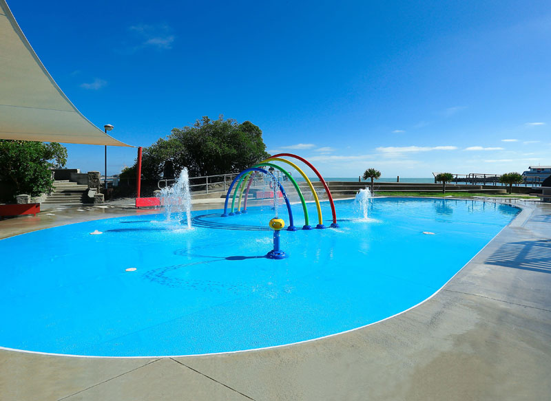 In the case of the Scarborough Splash Pad in Christchurch, New Zealand, an older splash pad (or paddling pool as they call them in New Zealand) had been damaged by an earthquake and needed replacement. The new splash pad was constructed using stainless steel walls and a reinforced PVC membrane, chosen for its slipresistant qualities and ability to shift with ground movement, among other reasons. In this particular case, it offers a zero-depth splash pad area that extends into a slightly deeper “padding pool” all covered with the reinforced PVC membrane.