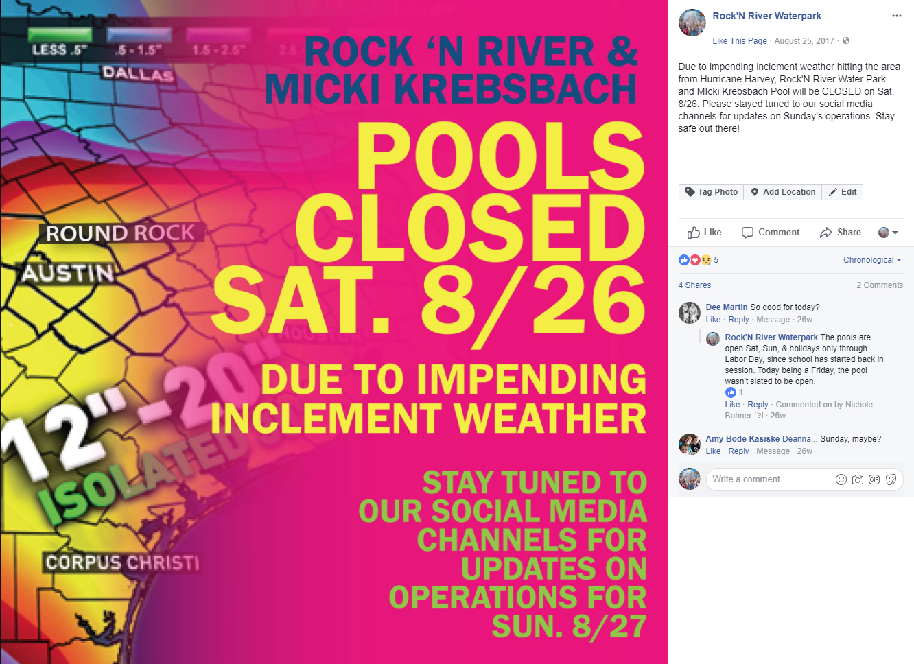 This also served as a helpful tool to spread the word about an unexpected pool closure that occurred because of inclement weather. When Hurricane Harvey hit Texas, the surrounding storms in central Texas necessitated that we close our pools. The facility’s Facebook pages effectively supplemented our existing protocols for getting the word out.