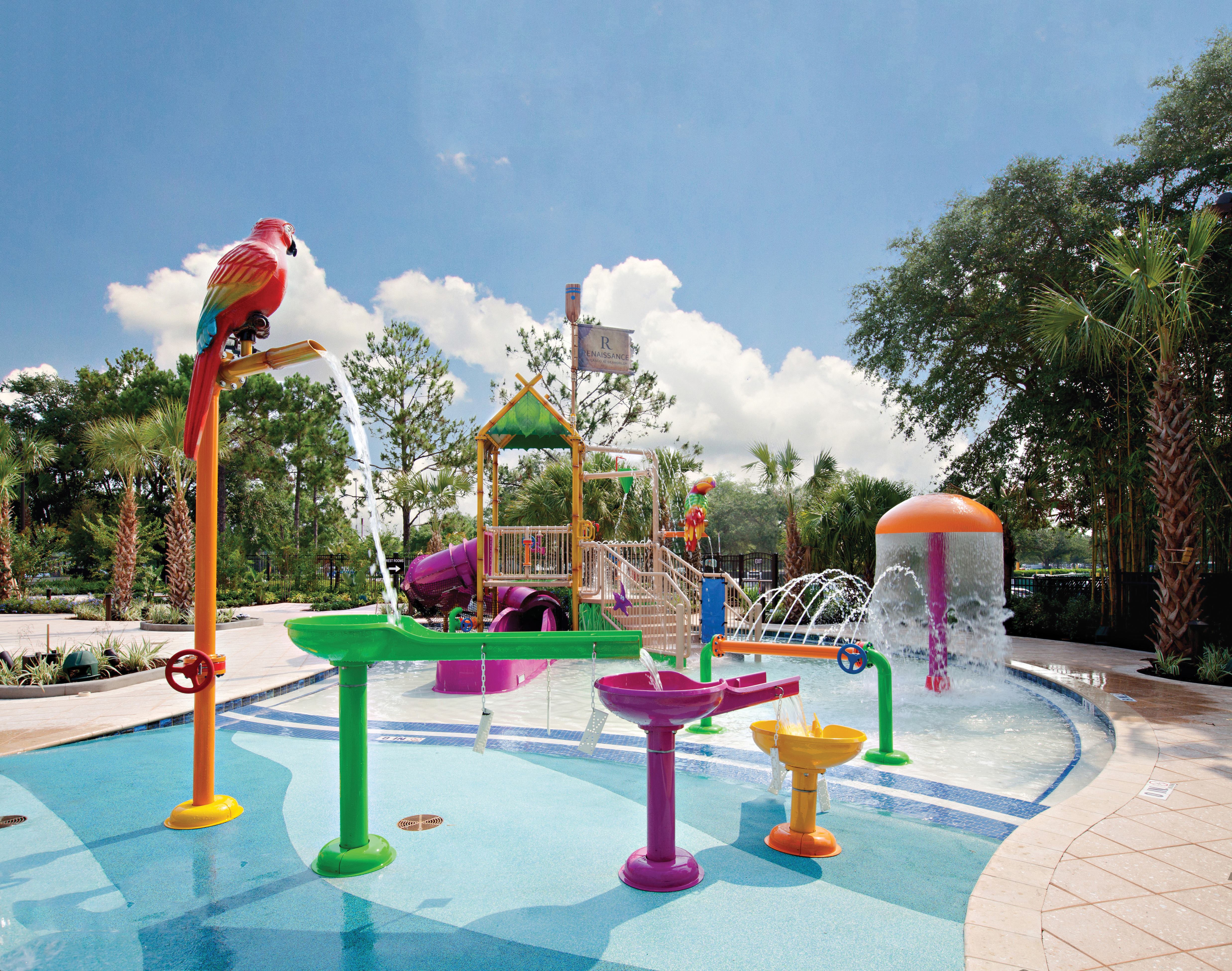 As an expansion of an existing hotel, the aquatics space had to … As an expansion of an existing hotel, the aquatics space had to be developed within the confines of the tennis courts it would replace — all while the hotel remained fully operational. Several cost-saving measures were used to stay on budget, such as reusing existing mechanical spaces and landscaping areas, and encouraging the owner to finalize and approve play features upfront to reduce change orders and streamline construction.