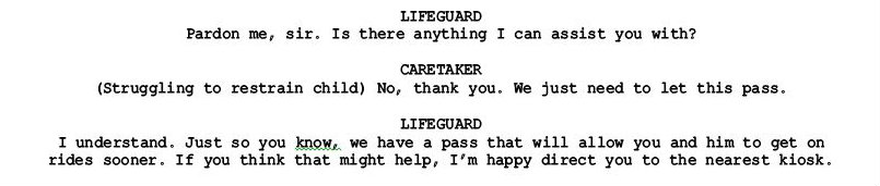 Why it works: Why it works: Becoming involved in a parental matter might go against a lifeguard’s instinct. But by offering a helping hand, you help curb another potential cause of escalation — intervention from other customers. Parents will commonly explain that the child has autism, which is the guard’s cue to point out quiet areas and baby-care stations and discuss the assisted access pass, Pastor says.