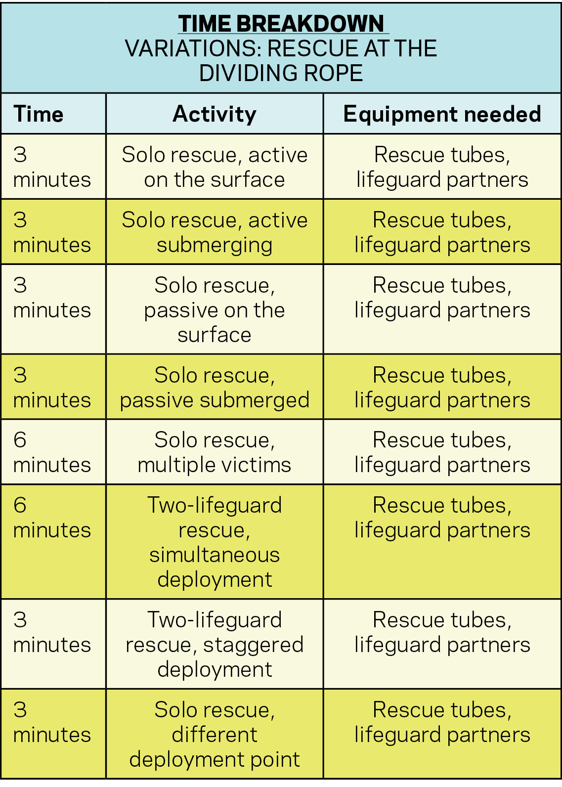 If your drill trains lifeguard staff to make a solo rescue of a victim at the dividing rope between shallow and deep water, then provide a variation to the drill by deploying two rescuers to the victim. If your drill trains the presentation of an active victim on the surface, then add a variation where the victim is active but submerges. If your drill focuses on treating a bee sting, then have the patient begin to present difficulty breathing, so the lifeguard must expand their scope of care.