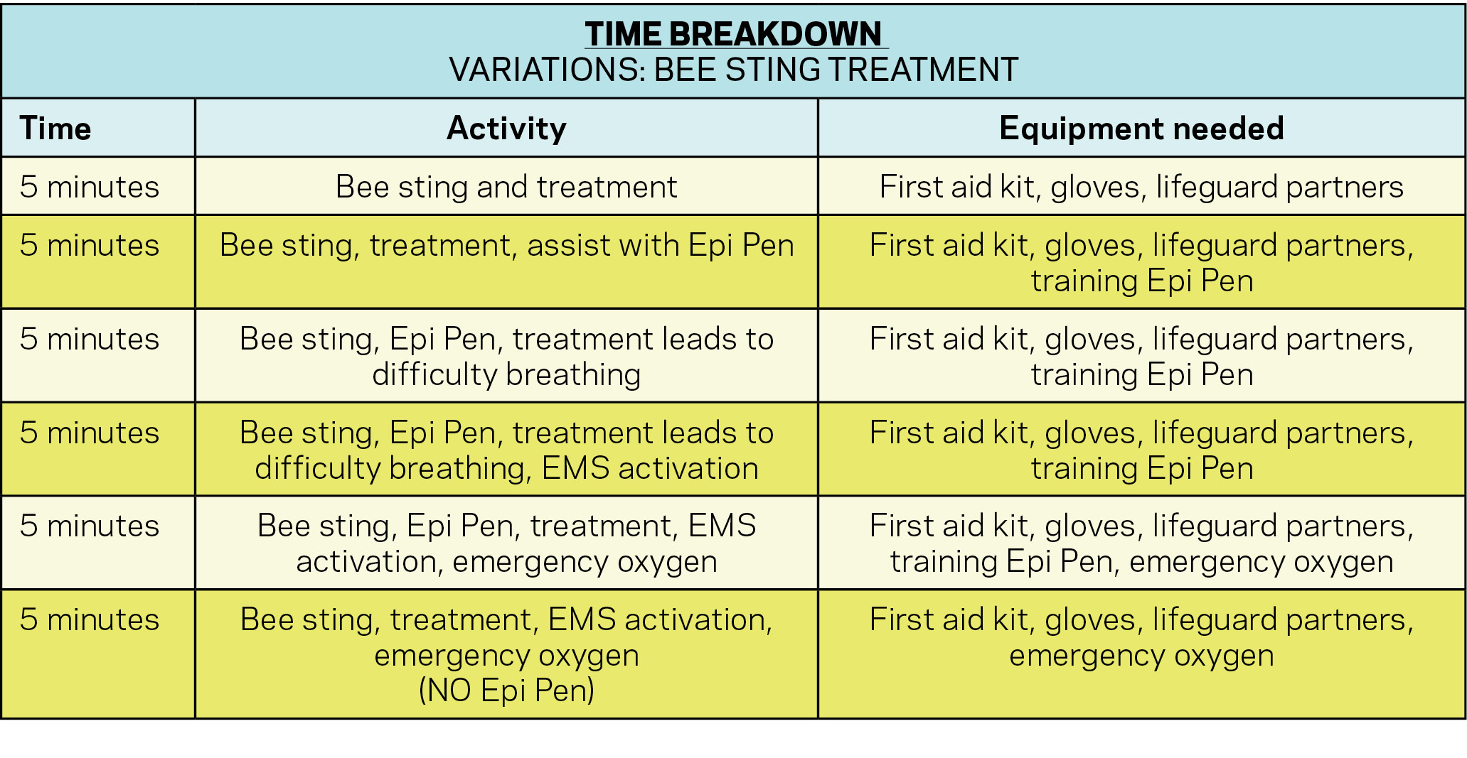 Let’s review potential variations for a drill where you have a child victim suffering from a bee sting and draft a 30-minute in-service.
