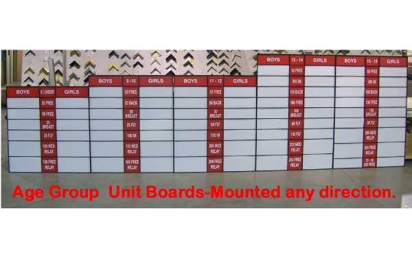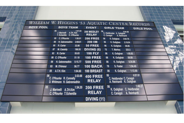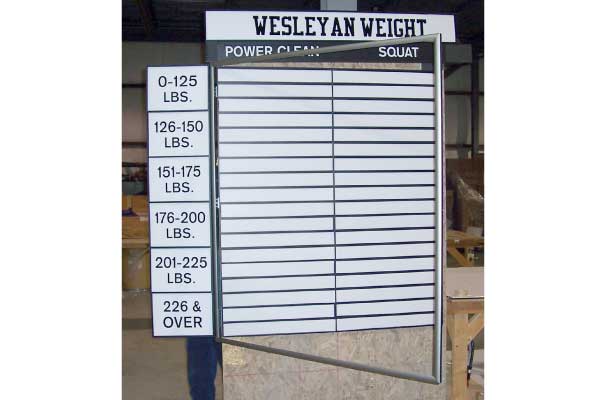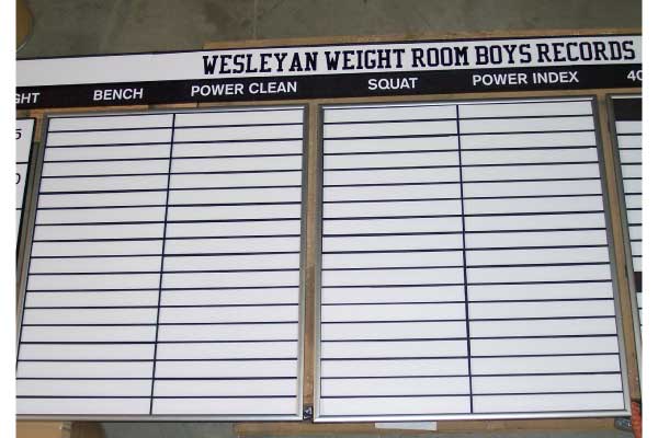 For over 30 years, Grid Concepts has been providing colleges, high schools, and clubs with custom record boards of the highest quality. All of our boards are customized for our unique customer’s needs. Our boards include panels with adhesive lettering that doesn’t have to slide or snap into place. In addition, school colors are included in the design of each board, along with logos, and with pre-applied lettering on the “T” panels. We can also add athlete’s names to the boards for a more personalized look and a front-loading display frame. If you have an existing board from Grid Concepts, we can create add-on sections for it at a later date. Designed by coaches, our record board systems offer the convenience, look, and quality you need to record your events, all at a competitive price. Let us help you create a competitive atmosphere, where records are made to be broken, with our record boards. Grid Concepts: the record board that motivates and recognizes athletes.