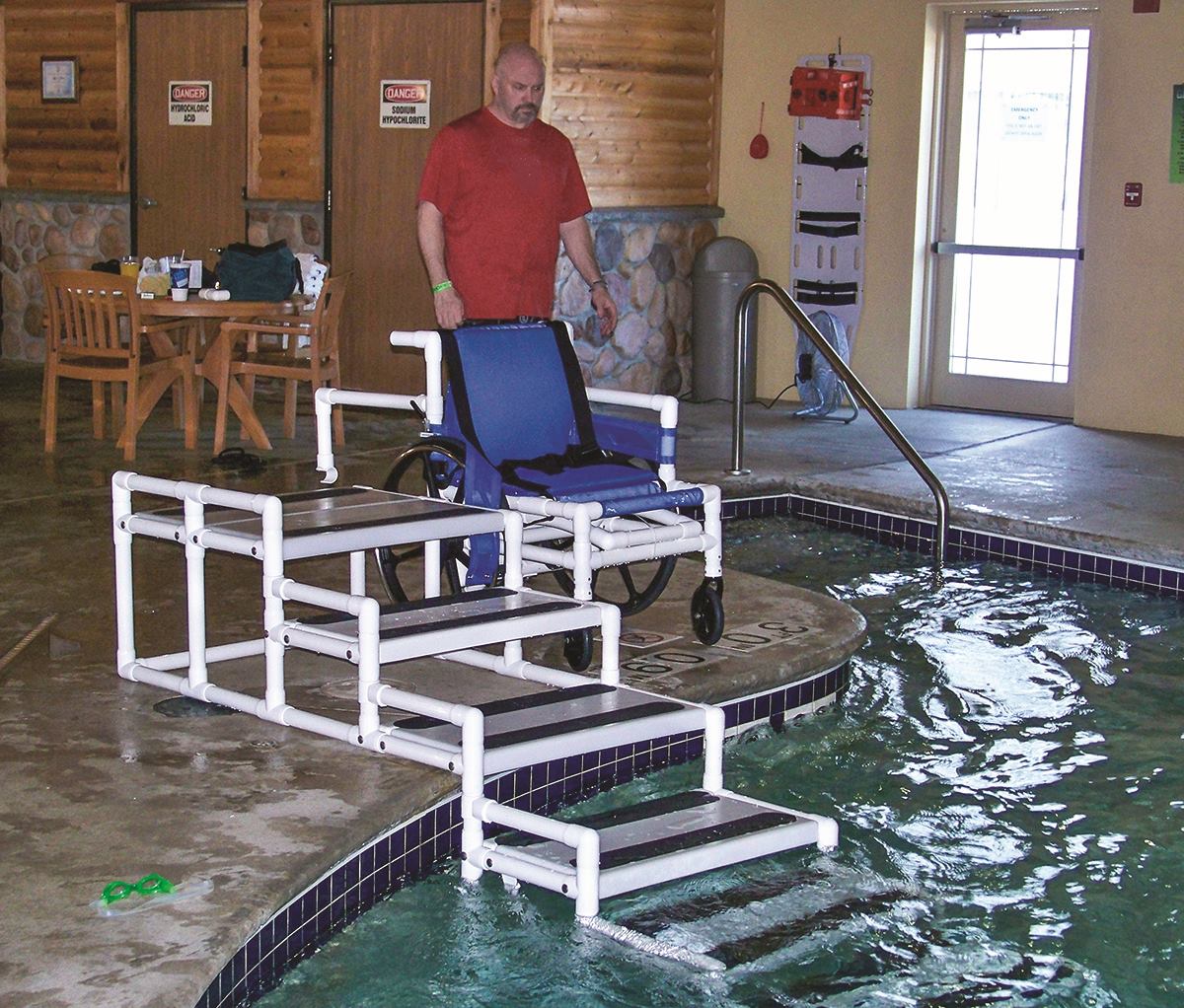 The fully ADA-compliant Aquatrek ADA Transfer System from Rehab Systems, LLC, can be used as the primary ADA access point for leisure rivers, wave-action pools, therapy pools, sand-bottom pools, spas and other pools where access to the water is limited to one area, and everyone gets in and out at the same place.