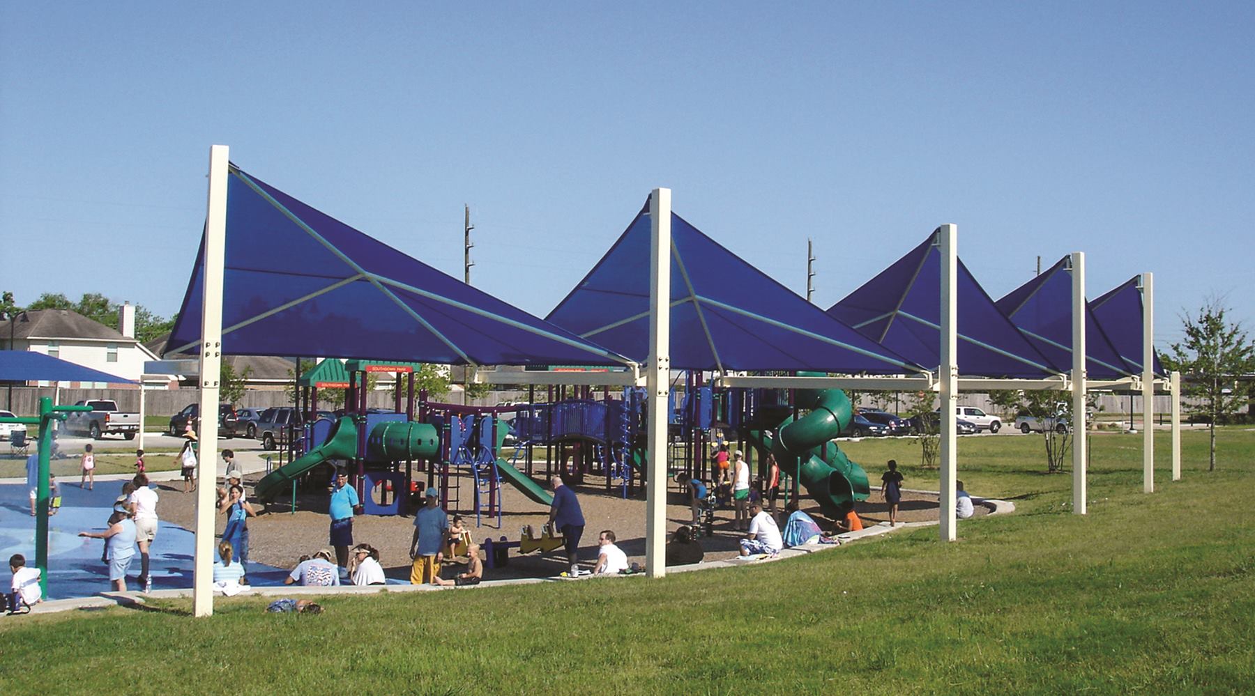 The Custom Cantilever Waves structures from USA Shade’s Sun Ports provide shade for those looking to take a break from the sun. The structures utilize fabrics that blend in with the design themes of the facility. Contact: 800.966.5005; SunPorts.com