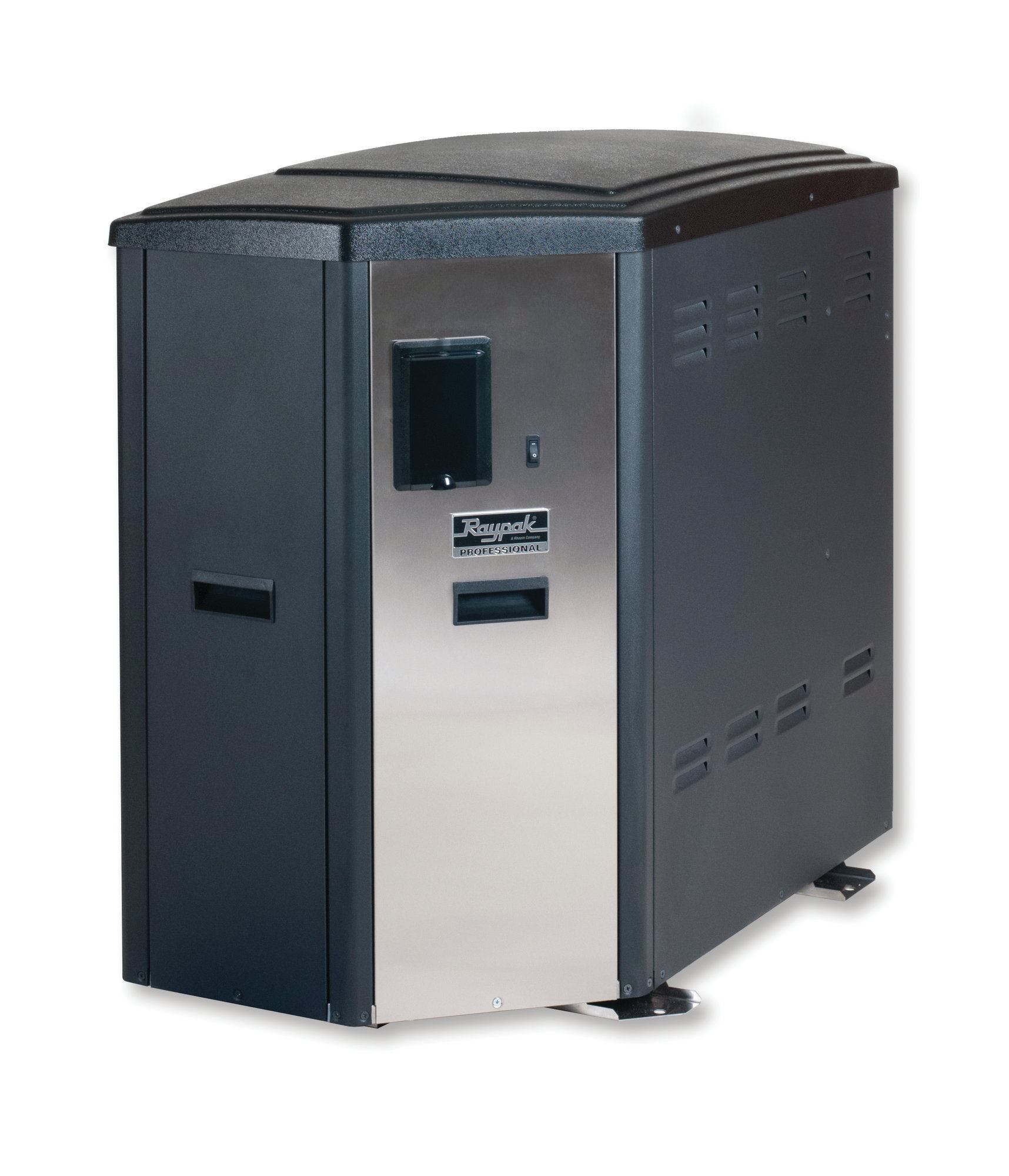 The Professional X94 High-Efficiency Gas Heater from Raypak Inc. has an input rate of 399kBTU, stainless steel ASME heat exchanger, sealed combustion, direct vent and digital controls.